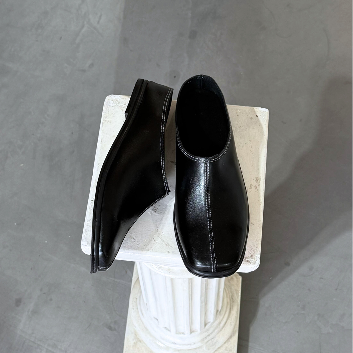 Su puntera suavemente cuadrada aporta una presencia moderna y estructurada, mientras que la costura central visible recorre la capellada desde el empeine hasta la punta, generando una línea limpia que estiliza visualmente el pie y refuerza su identidad minimalista.